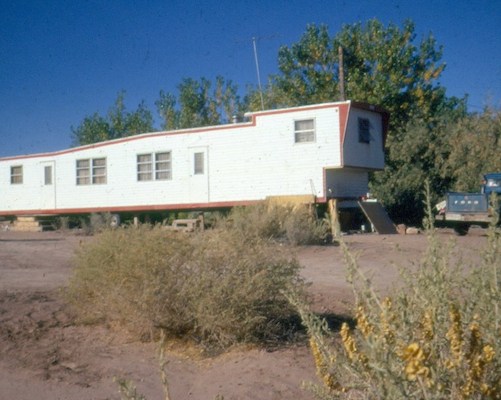 It was time to move our family onto the Navajo Reservation, which meant that the trailer house which Mom & Dad (Peggy & David Scates) had purchased was to be moved 45 miles from Cortez, CO to Teec Nos Pos, AZ. (pronounced teese naus paus) ) This was a first stop while Dad was to build a home for us at Red Mesa, another 17 miles down the road. Teec means tree in Navajo and Teec Nos Pos means something like a grove of trees.