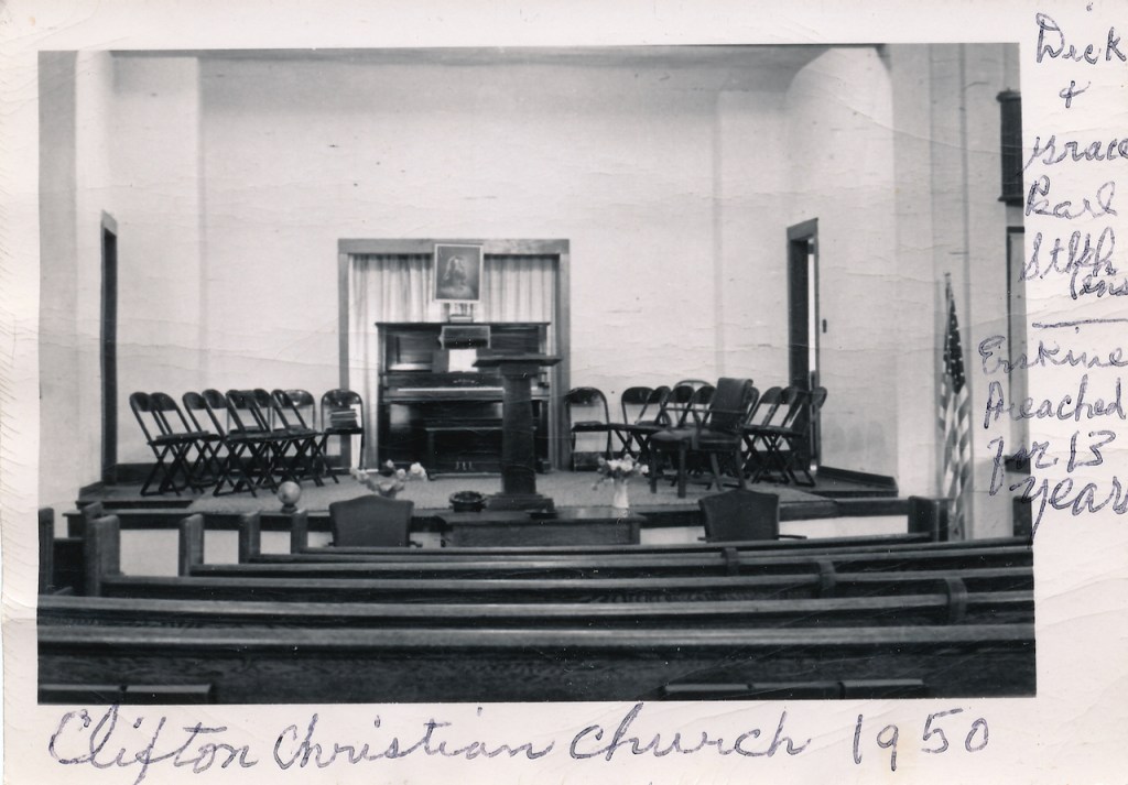 1948/49: At the age of 6 or 7 I recall a Sunday evening church service. Tim and I were sitting next to other children in about the second row from the front of the Clifton Christian Church. Tim and I were squabbling with each other and causing enough of a disturbance to catch my dad’s attention. He was in the middle of his sermon, but being a person of decisive actions, he left the pulpit, walked down the steps of the platform, and came directly to our row. He picked Tim and I up with one hand and swatted us soundly on the behind with the other hand. He turned around, walked back up to the pulpit, and resumed his sermon. Ruth Gardner Creager told me, when Ann and I visited her in 2014, that the whole row of kids was silent after that.