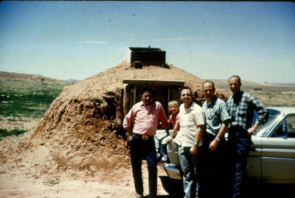 1966: featured photo is our auntie Grace Oldman in front of her hooghan at Red Mesa AZ, which is a log structure (picture an eight sided one room log cabin) with log roof (picture logs in a bowl shape and turned upside down on the octagon shaped “cabin”) and covered with the clay soil for insulation.
