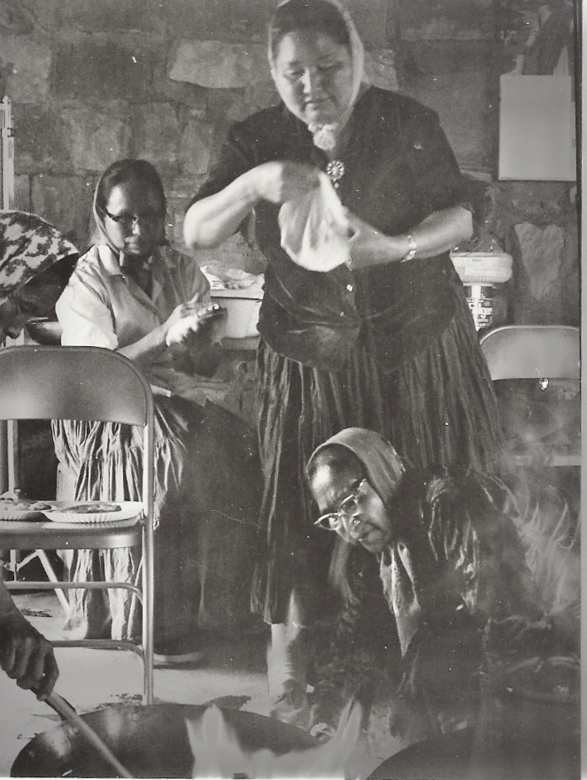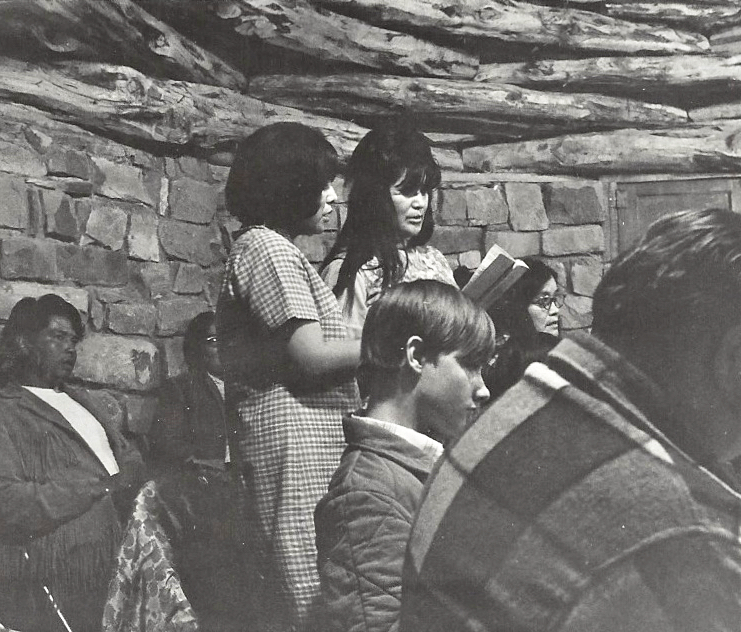 1970: These ladies are singing a song in Navajo for the church service. Note the stone walls and the log roof.