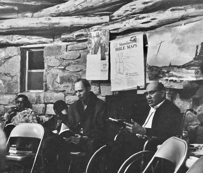 1970: David & evangelist John Peter Yazzie holding a service in the hooghan.